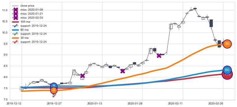 上涨趋势2019-12-12-2020-02-26,均线80, 105, 30确认关键支撑1处