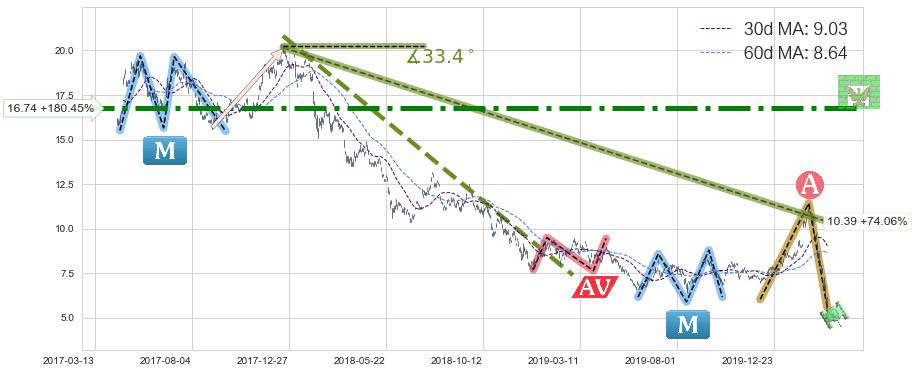 从2017-12-18至2020-03-13,共包含562个交易日,阶段股价下跌-103.04%,阶段股价变动位移路程比: 1 : 9,下跌趋势角度: 33.4