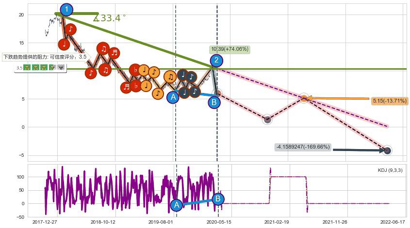 ♘ 在最后的下跌阶段2017-12-18至2020-03-13,存在 持续未破位的阻力位 ,阻力价格10.39,可信任强度81.59%,其距离最后价格5.97相差 +74.06%