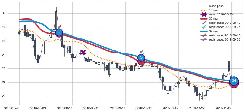⚄ 均线向上突破后价格上探力度高,正乖离率高,再次向下破位后维持原均线下跌趋势【弱】