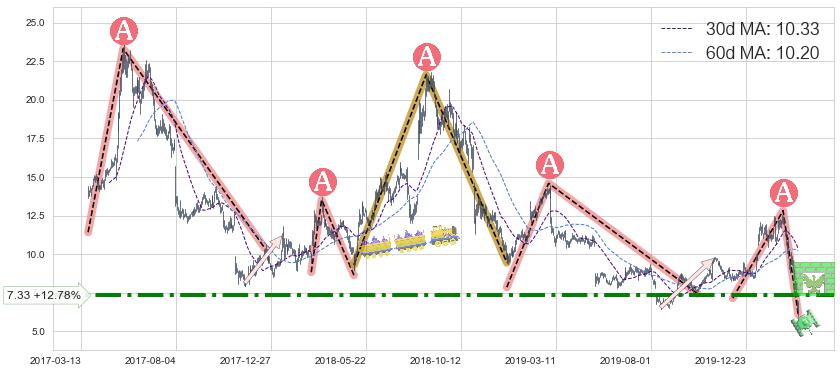 ♘ 阻力价格位7.33,可信任强度77.09%,距离最后交易2020-03-13形成的收盘价格6.50相差 +12.78%