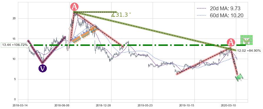 从2018-08-21至2020-03-13,共包含393个交易日,阶段股价下跌-94.05%,阶段股价变动位移路程比: 1 : 9,下跌趋势角度: 31.3