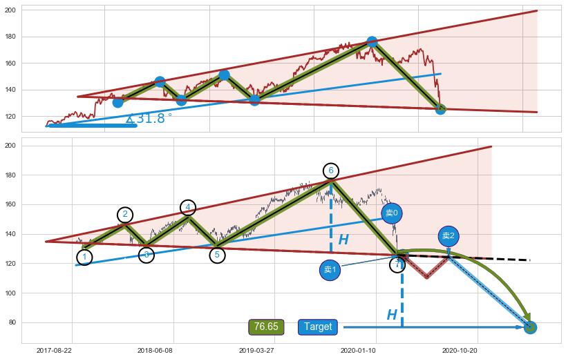 ➢ 最小反转跌幅→𝐇: 48.71 (逐步抬高阻力斜边最后的阻力点⑥与支撑边垂直距离)