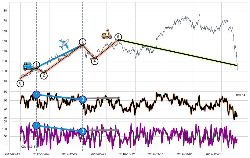 ➣ 第一, 三驱动浪端点:【KDJ】走势出现【常规背离 & 反转信号】背离程度55.90%,背离夹角角度92.4˚,背离程度中等