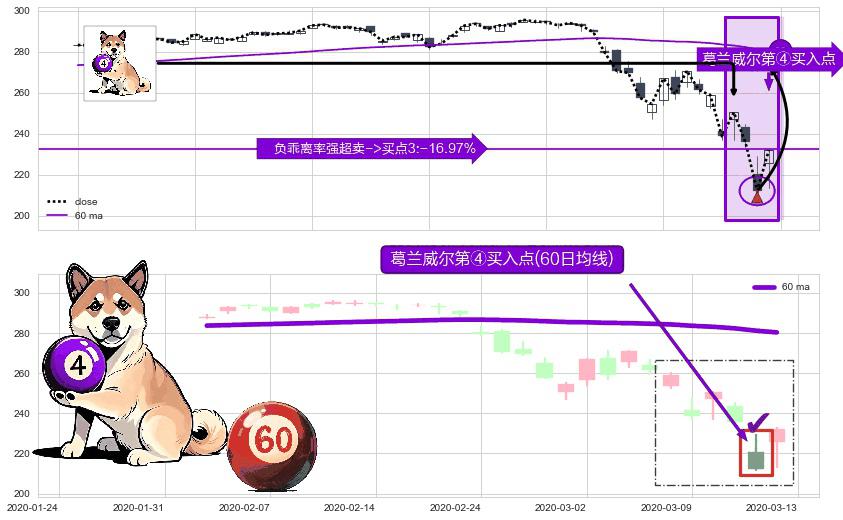 形态多维评估: ⚀ 2020-03-12-日显现 葛兰威尔均线 60日均线 第④买入点 下降趋势均值回复的短线反弹信号,后市看涨,买进信号