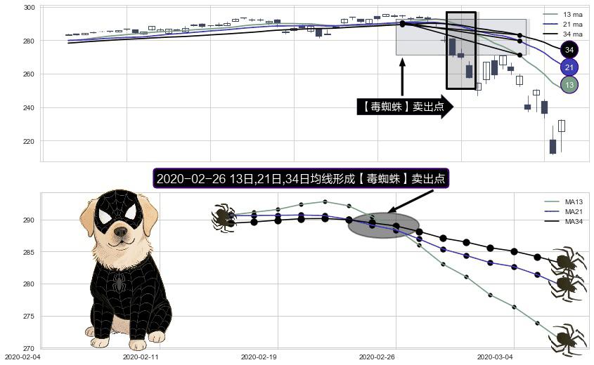 形态多维评估: ⚀ 2020-02-26日显现 13日-21日-34日均线 【毒蜘蛛】卖出点 看空信号,后市看跌,卖出