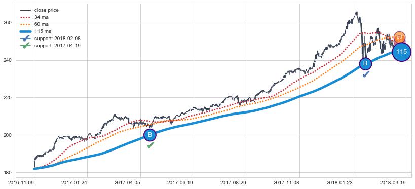 上涨趋势2016-11-09-2018-03-19,均线115确认关键支撑2处