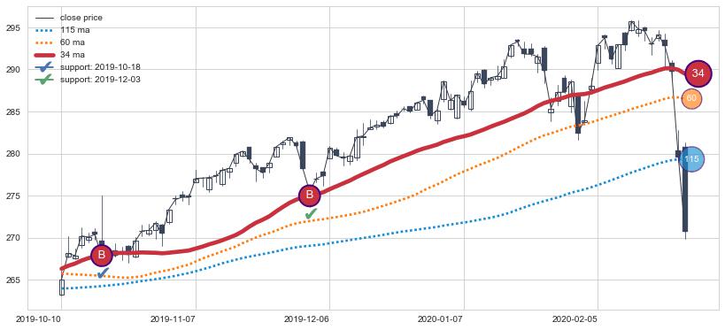 上涨趋势2019-10-10-2020-02-25,均线34确认关键支撑2处