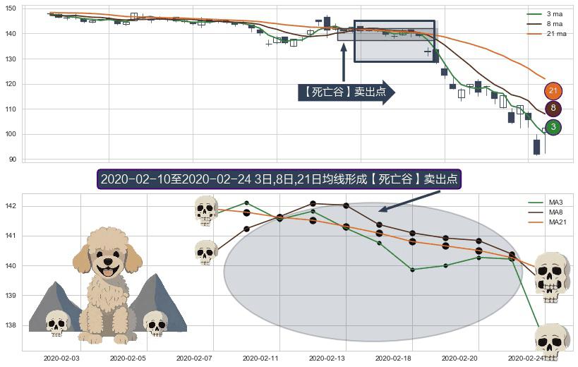 ⚂ 【死亡谷】卖出点 由MA3均线下穿MA8均线和MA21均线,MA8均线下穿MA21均线形成