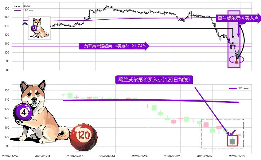 形态多维评估: ⚀ 2020-03-12-日显现 葛兰威尔均线 120日均线 第④买入点 下降趋势均值回复的短线反弹信号,后市看涨,买进信号