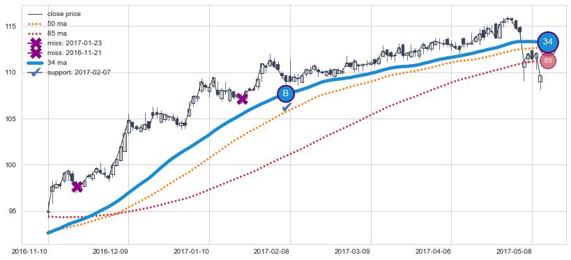 上涨趋势2016-11-10-2017-05-10,均线34确认关键支撑1处