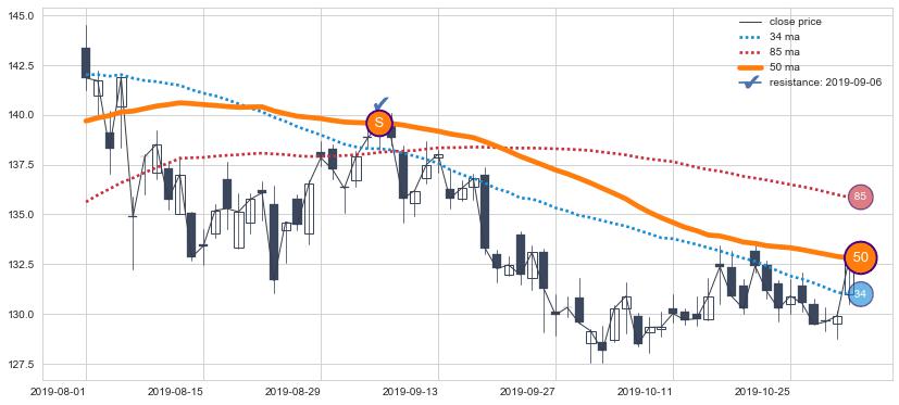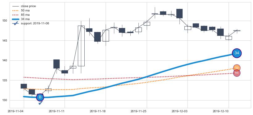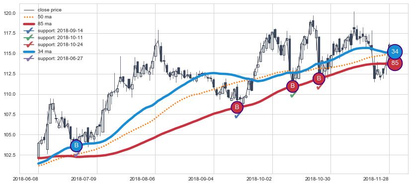 上涨趋势2018-06-08-2018-11-28,均线34, 85确认关键支撑4处