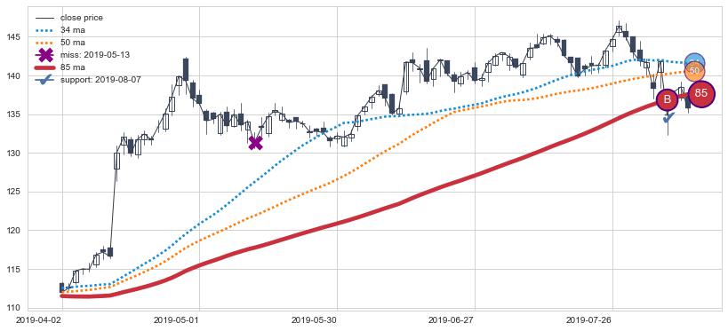 上涨趋势2019-04-02-2019-08-12,均线85确认关键支撑1处