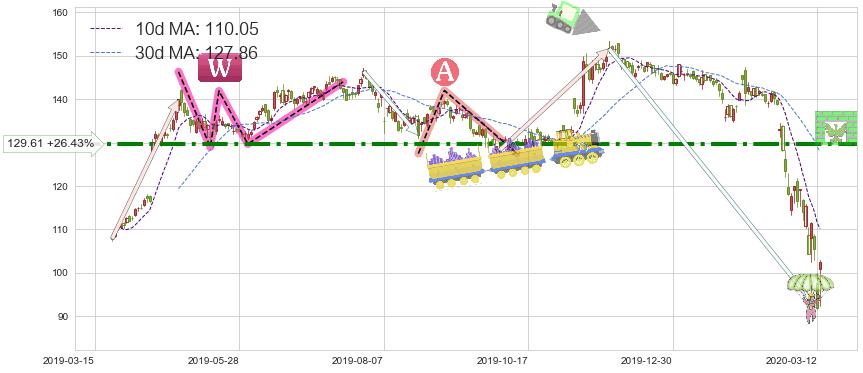 ♘ 阻力价格位129.61,可信任强度82.21%,距离最后交易2020-03-13形成的收盘价格102.52相差 +26.43%