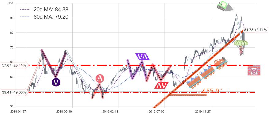 从2018-12-24至2020-03-11,共包含305个交易日,阶段股价上涨80.68%,阶段股价变动位移路程比: 1 : 6,上涨趋势角度: 55.9