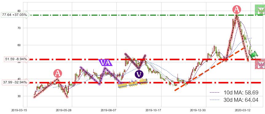 ♘ 支撑价格位51.59,可信任强度91.07%,距离最后交易2020-03-13形成的收盘价格56.65相差 -8.94%