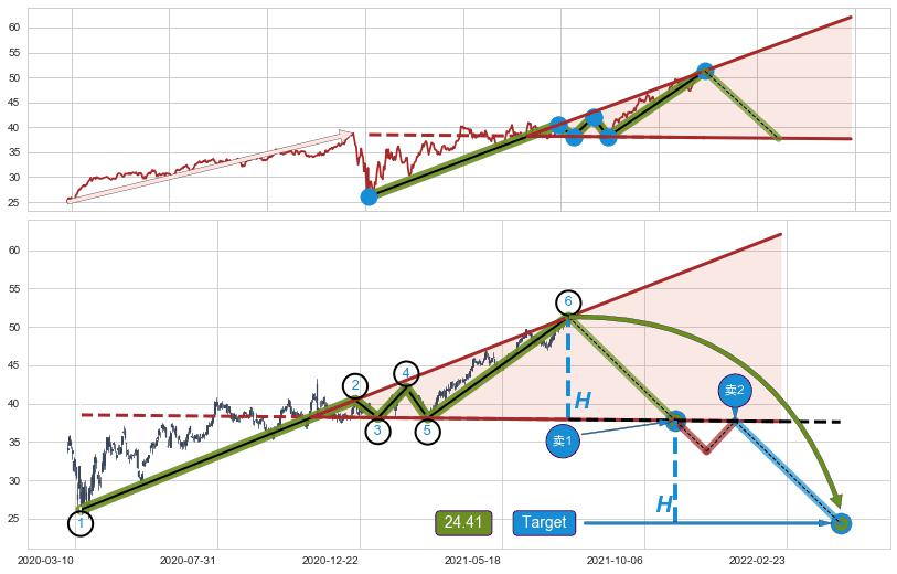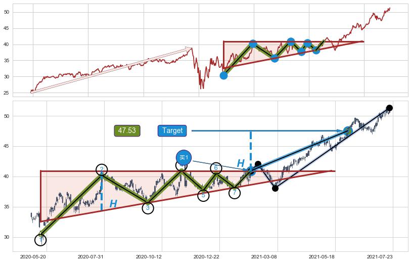 ➢ 最小反转跌幅→𝐇: 13.37 (逐步抬高阻力斜边最后的阻力点⑥与支撑边垂直距离)