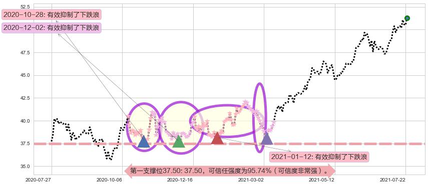 ♞ 第一支撑位37.50价格为37.50,其通过量化计算出的可信任强度为95.74%(可信度非常强)。
