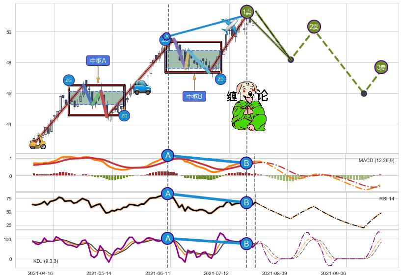 ➣ 【中枢B】:2021-06-14-2021-06-30,中枢由4笔构成,共13交易日, ZG=48.75, ZD=47.60