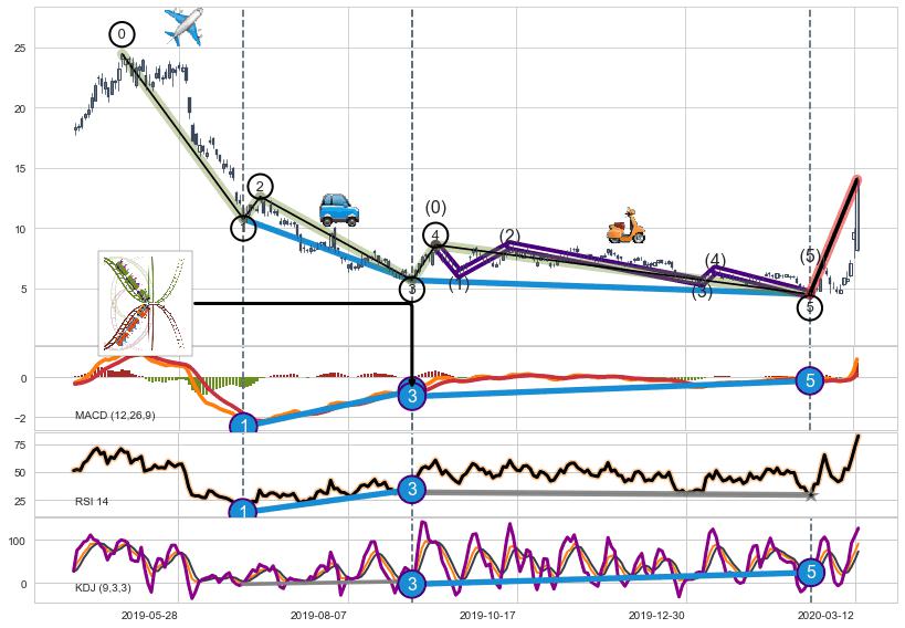 ➢ 1,3,5驱动浪MACD, RSI, KDJ走势都出现【常规背离】反转信号增强
