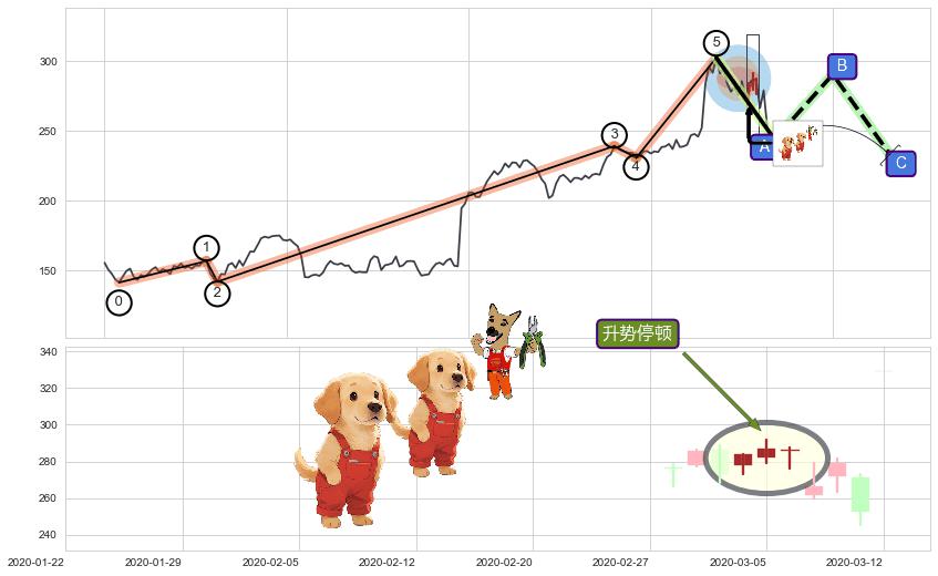 | 3 🅚:吊颈线(上吊线) ➕ 🌊:波浪理论猜想上涨浪5已形成,猜想后续形成回调abc下跌(均值回复) ☞ 看空信号 ⇥ 【🅚线】交织【图形】⇥ 综合量化分数: 48 | > |