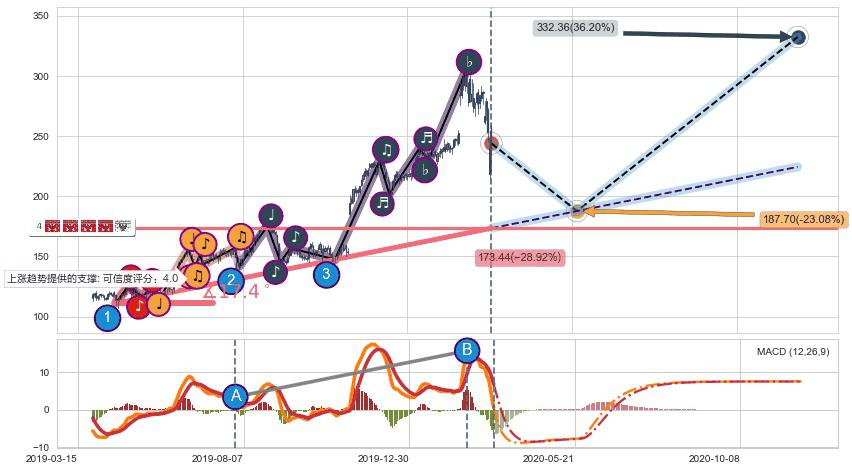 ♘ 在最后的上升阶段2019-04-17至2020-03-04存在 持续未破位的支撑位 ,支撑价格173.44,支撑可信任强度84.93%,其距离最后价格244.02相差 -28.92%