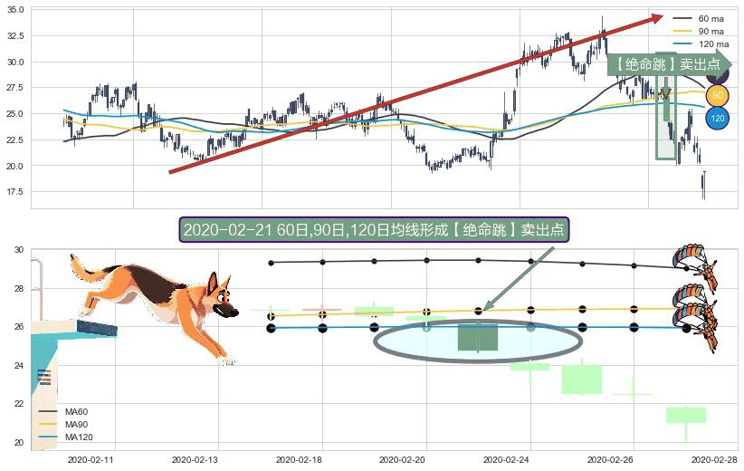 形态多维评估: ⚀ 2020-02-21日显现 60日-90日-120日均线 【绝命跳】卖出点 看空信号,后市看跌,卖出