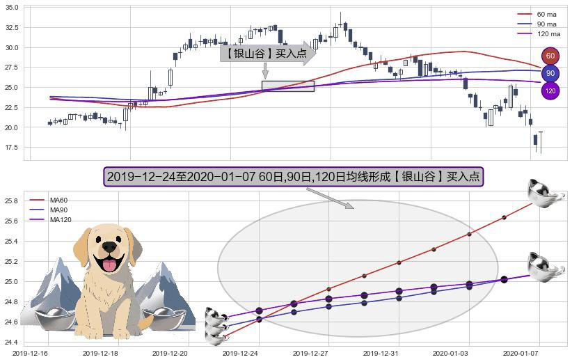 形态多维评估: ⚀ 2019-12-26-日至2020-01-07-日显现 60日-90日-120日均线 【银山谷】买入点 看多信号,后市看涨,买入