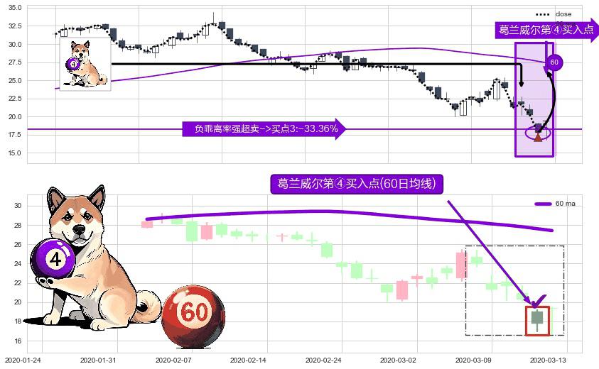形态多维评估: ⚀ 2020-03-12-日显现 葛兰威尔均线 60日均线 第④买入点 下降趋势均值回复的短线反弹信号,后市看涨,买进信号