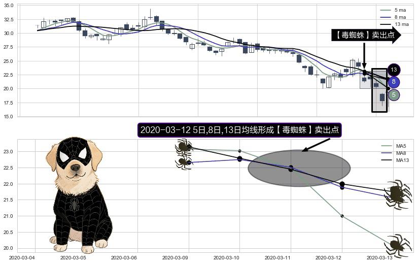 形态多维评估: ⚀ 2020-03-12日显现 5日-8日-13日均线 【毒蜘蛛】卖出点 看空信号,后市看跌,卖出