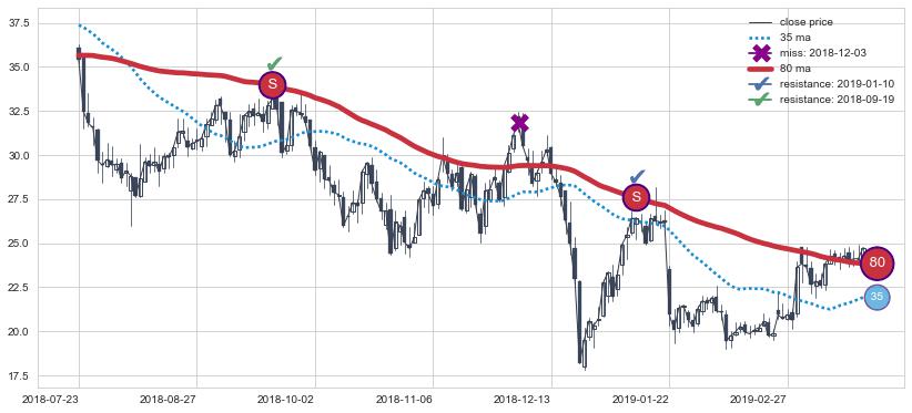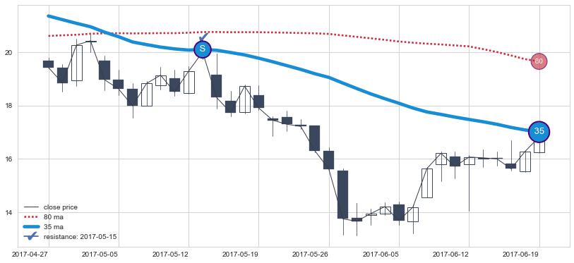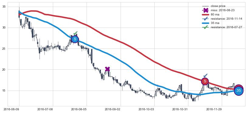 下跌趋势2016-06-09-2016-12-08,均线80, 35确认关键阻力2处