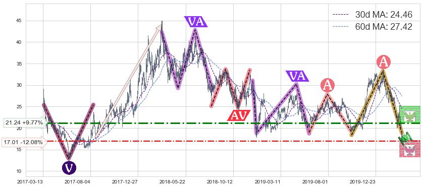 ♘ 支撑价格位17.01,可信任强度54.19%,距离最后交易2020-03-13形成的收盘价格19.35相差 -12.08%