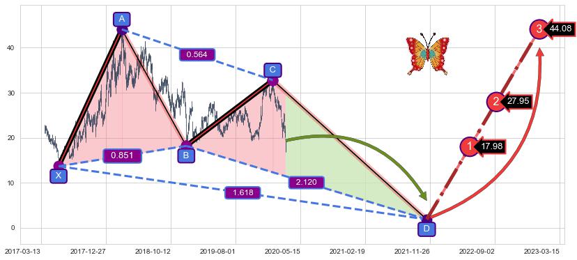 ➣ 未完成【蝴蝶】形态起点X: 2017-05-31, 已到达C点: 2020-01-15, 预测最终D点: 2021-11-12, 共1136交易日
