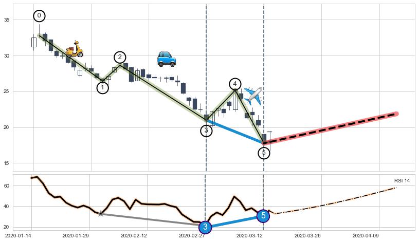 ➣ 第三,五驱动浪端点:【RSI】走势出现【常规背离 & 反转信号】背离程度99.00%,背离夹角角度57.7˚,背离程度较大
