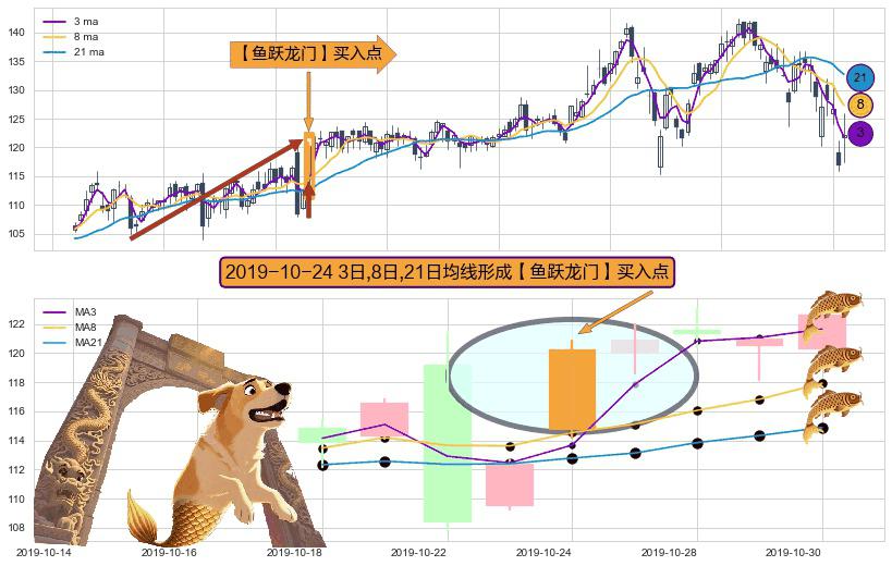 ⚀ 2019-10-24日显现 3日-8日-21日均线 【鱼跃龙门】买入点 看多信号,后市看涨,买入