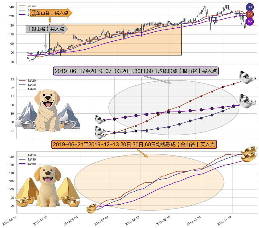 ⚂ 2019-06-24-日至2019-12-13-日显现 20日-30日-60日均线 【金山谷】买入点 其再次确认了买入信号,可靠性更强,买入