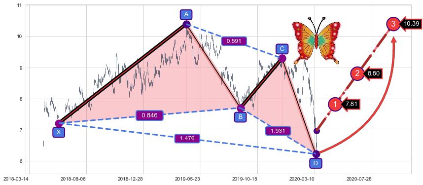 ➣ 已完成【蝴蝶】形态起点X: 2018-05-29, 终点D: 2020-03-12, 共451交易日