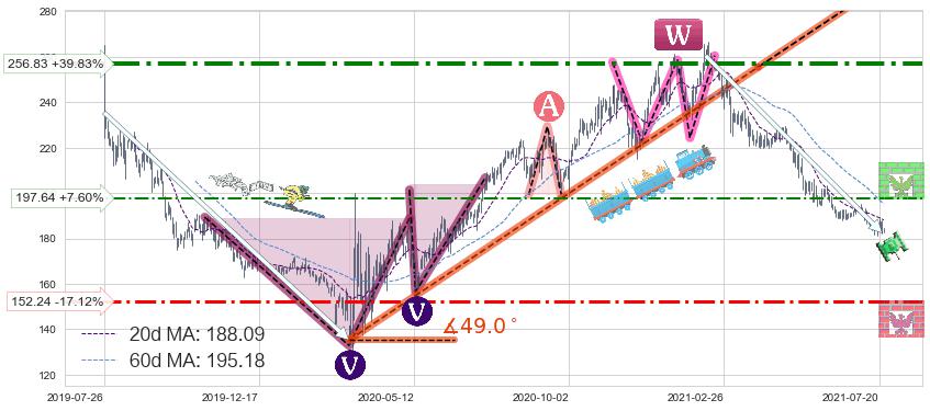 ♘ 阻力价格位197.64,可信任强度37.77%,距离最后交易2021-07-23形成的收盘价格183.68相差 +7.60%
