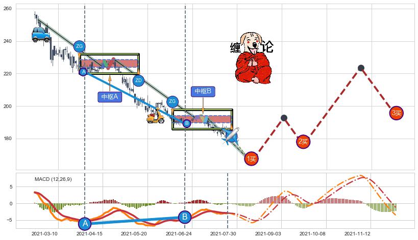 ➢ 【中枢A】:2020-05-07-2020-07-08,中枢由5笔构成,共43交易日, ZG=184.66, ZD=177.38