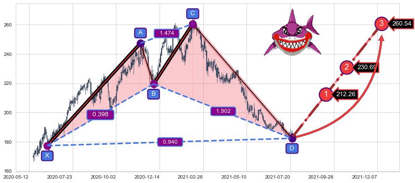 ➣ 已完成【鲨鱼】形态起点X: 2020-06-11, 终点D: 2021-07-22, 共282交易日