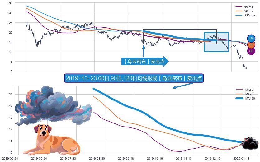 ⚀ 2019-08-08日-2020-01-09日显现 60日-90日-120日均线 【乌云密布】卖出点 看空信号,后市看跌,卖出