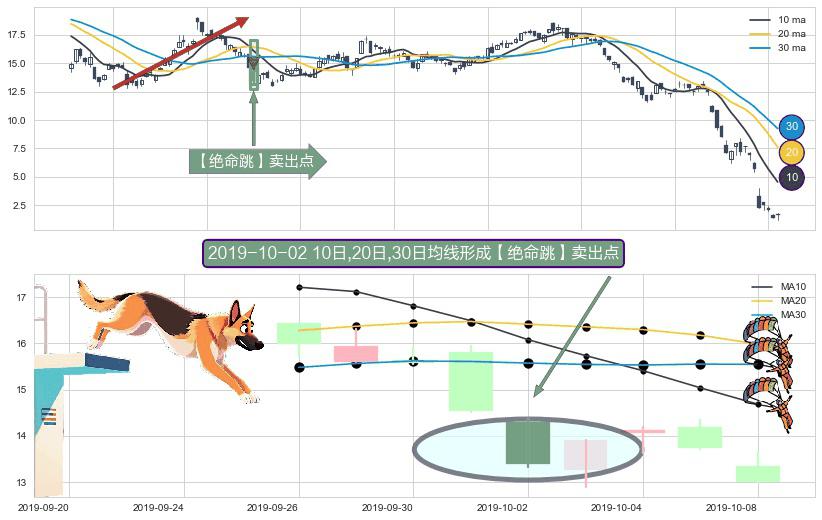 ⚀ 2019-10-02日显现 10日-20日-30日均线 【绝命跳】卖出点 看空信号,后市看跌,卖出