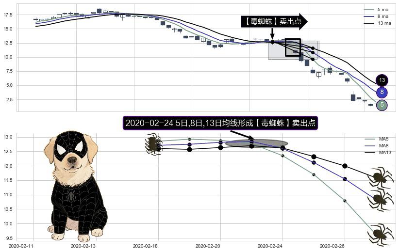 ⚀ 2020-02-24日显现 5日-8日-13日均线 【毒蜘蛛】卖出点 看空信号,后市看跌,卖出