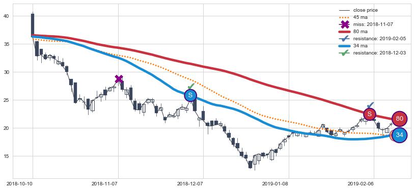 ⚄ 均线向上突破后价格上探力度低,正乖离率低,再次向下破位后维持原均线下跌趋势【强】