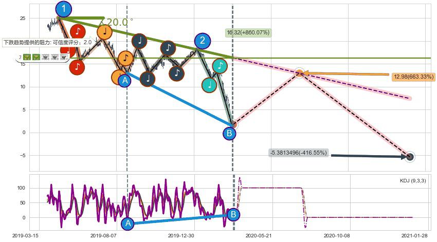 ♘ 在最后的下跌阶段2019-04-22至2020-03-13,存在 持续未破位的阻力位 ,阻力价格16.32,可信任强度62.07%,其距离最后价格1.7000相差 +860.07%