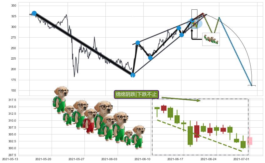 ➣ 【中枢B】:2021-06-17-2021-07-02,中枢由5笔构成,共12交易日, ZG=305.86, ZD=301.17