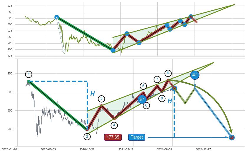 ➢ 最小中继整理跌幅→𝐇: 132.13 (𝐇楔型旗杆的长度:楔型起点→顶点)