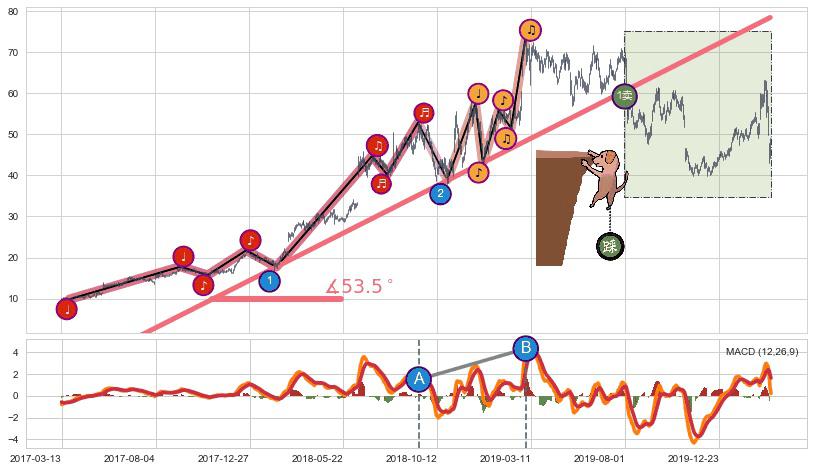 从2017-03-24至2019-05-02,共包含529个交易日,阶段股价上涨220.65%,阶段股价变动位移路程比: 1 : 5,上涨趋势角度: 53.5