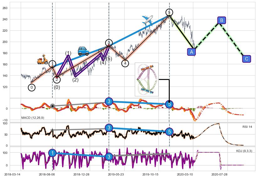 ➣ 1,3,5驱动浪MACD, RSI, KDJ走势都出现【常规背离】反转信号增强