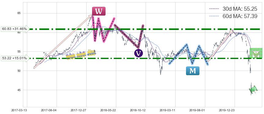 ♘ 阻力价格位60.83,可信任强度97.48%,距离最后交易2020-03-13形成的收盘价格46.27相差 +31.46%